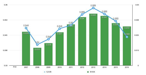 財(cái)報(bào)顯示,自2014年起,全食的凈利率、毛利率開(kāi)始雙雙持續(xù)性走低,營(yíng)收增長(zhǎng)乏力。2016年,公司錄得收入157.24億美元,同比僅增2.17%,創(chuàng)下了7年新低,凈利潤(rùn)5.07億美元,同比下降5.4%。