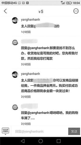 “你到時候把商品的鏈接給我,然后就是你的收貨地址,每件商品你要給我2塊錢的押金,到了11號那天,我來幫你搶東西,然后付款,沒搶到的話我會退押金,搶到的東西會直接由賣家郵給你,我把交易成功的截圖發(fā)給你之后,你給我付尾款就行了?!边@位出租“購物車車位”的商家說,之所以每件商品需要支付2元的押金,是為了防止違約。