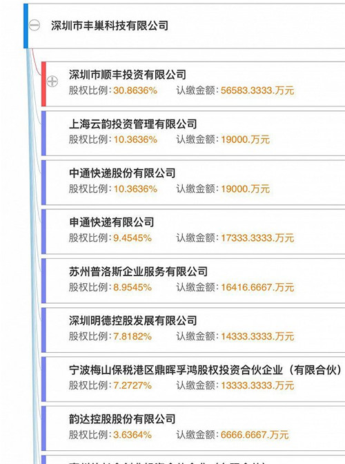 記者在企業(yè)工商信息查詢得知,目前豐巢科技最新的股權(quán)結(jié)構(gòu)為,深圳市順豐投資有限公司為大股東,持股30.8636%,韻達(dá)系(上海云韻投資+韻達(dá)控股)為第二股東,持股共14%,中通持股10.3636%,申通持股9.4545%。