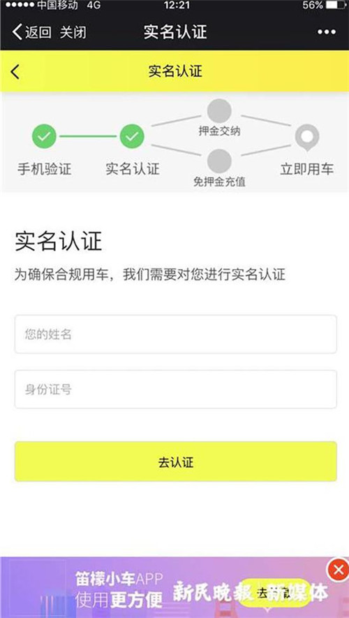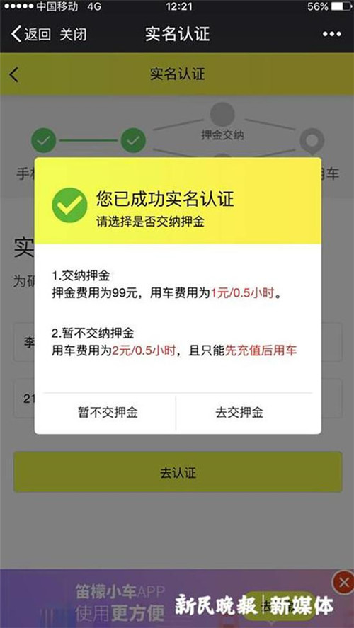 這輛黃色小車車身上貼有二維碼,并寫著“掃碼一元用車”,右側(cè)后輪安裝有四位密碼鎖。小新嘗試掃碼,跟共享單車注冊流程相似,需要手機(jī)注冊和實(shí)名認(rèn)證。實(shí)名認(rèn)證后,則可選擇是否交納押金,按提示說明,兩者在后續(xù)使用費(fèi)用上存在差異,交納99元押金后的使用價格便宜一些,半小時1元。