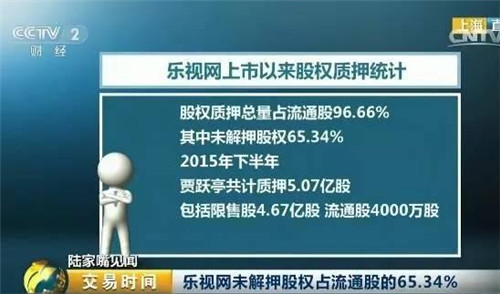 樂視網(wǎng)還通過股權(quán)質(zhì)押的方式獲得資金。目前,樂視網(wǎng)股權(quán)質(zhì)押的總量占流通股的比例為96.66%,其中65.34%的股權(quán)未解押。而樂視網(wǎng)最大的一筆股權(quán)質(zhì)押發(fā)生在2015年下半年,賈躍亭將其持有的限售股4.67億股、流通股4000萬股,共計(jì)5.07億股進(jìn)行質(zhì)押,借入近百億資金,用于樂視生態(tài)業(yè)務(wù)的發(fā)展投入。