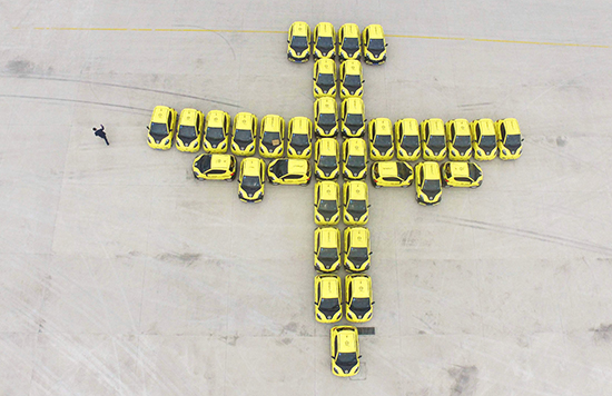 “小黃車”擺放成飛機(jī)形狀,屹立在航空?qǐng)@區(qū)內(nèi),甚為壯觀。吸引了多家媒體記者紛紛試駕試駕,記者們?cè)囻{之后,對(duì)其贊不絕口。