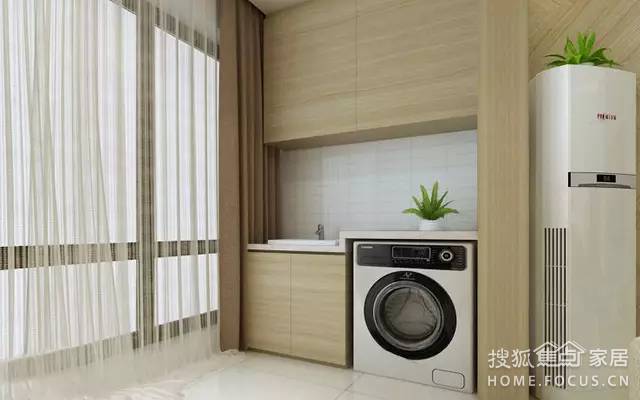 為了避免洗衣機影響整體簡約的美感,把洗衣機組合柜設置在落地窗封閉式陽臺的一側角落里,戶主將這個角落打造成了一個簡單又實用的空間,洗衣機左側是洗手池,上方有柜子,可以用來放置洗衣粉等用品,洗衣機上方的綠色植物又可以起到點綴作用,柔化了洗衣機的生硬形象。