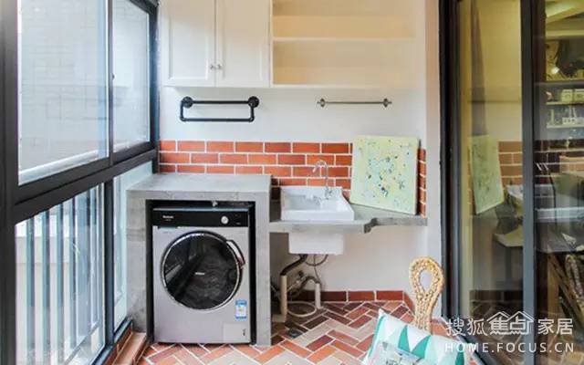 這是一款青春活潑的陽臺,地面和墻面都是復古紅磚風格,加上配合洗衣機的盥洗區(qū)下方的管道直接暴露出來,顯得十分自由隨意,洗衣機上方懸掛的兩個晾曬架,可以用來掛毛巾、小衣物等,這樣的陽臺洗衣機角落實用又有格調,適合年輕人。