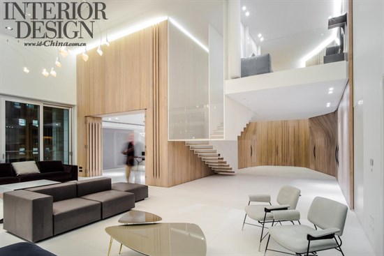 室內(nèi)的墻壁包覆著木質(zhì)皮膚,擴大的入口處能夠令人們順利地來到客廳區(qū),雙層的樓梯元素可以瞬間吸引人們的目光。在此空間內(nèi),樓梯是一種浮動的結(jié)構(gòu),從天花板通過垂直的鋼材漂浮下來,鋼結(jié)構(gòu)特別強調(diào)了自身的亮度和從面板上的脫離,呈現(xiàn)出的效果就好像漂浮在雙層空間的中間部位。當(dāng)行走在樓梯之上,眼睛可以通過垂直的木條縫隙望向遠方,也會置身在自己想象的神秘感中。