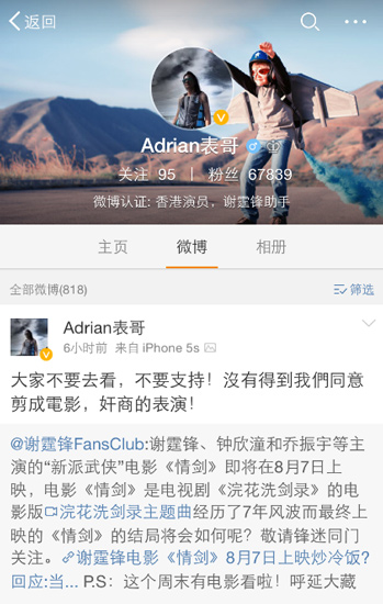 那么,《情劍》的兩位“主演”謝霆鋒與鐘欣桐為什么沒來宣傳本片呢?馬云對此表示:“兩位演員都還有別的戲要拍,沒時間來宣傳我們的電影?!钡皫兹崭勖絾柤傲藘扇说慕?jīng)紀人霍汶希,對方稱《情劍》片方根本沒有通知他們上映的事,更沒有邀請二人宣傳。而在微博上認證為“香港演員、謝霆鋒助手”的網(wǎng)友“Adrian表哥”也發(fā)微博指責片方并沒有得到謝霆鋒的同意,是奸商行為。另外,記者也查閱了《情劍》的官方微博,該官微在開辦至今僅發(fā)7條微博,有90個粉絲??梢哉f,《情劍》除了一組有“抄襲嫌疑”的海報之外幾乎是在沒有任何宣傳的情況下推進院線的。