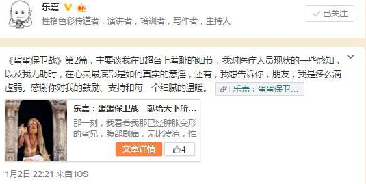 樂嘉在文中不僅敘述了傷后2次就醫(yī)照B超的過程,以及對醫(yī)療人員現(xiàn)狀的一些感知,還在文中自我安慰稱“我開始想我的丫頭靈兒,嗯,還好,樂門有后啦;我開始想40歲時幸好做了精子冷凍”。