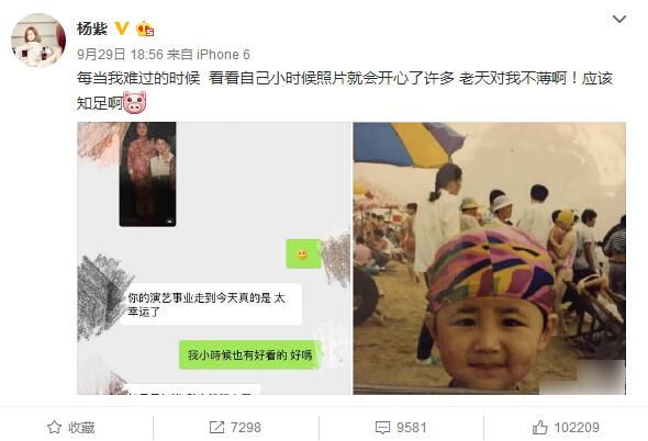 9月29日,楊紫曬出兩張照片,一張為聊天的截圖,一張為楊紫小時候的照片,楊紫寫道:“每當(dāng)我難過的時候,看看自己小時候照片就會開心了許多。老天對我不薄啊!應(yīng)該知足啊?!?/p>