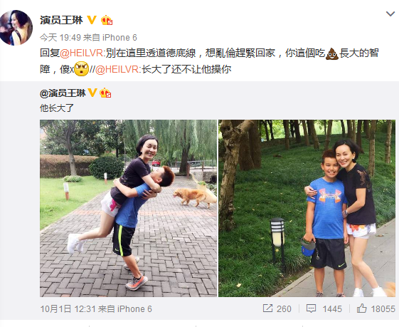 網(wǎng)友看到這一對高顏值的母子后,紛紛留言表示羨慕,而有網(wǎng)友卻在微博下辱罵到:“長大了還不讓他x你?!贝藲^評論也惹怒王琳,并手撕網(wǎng)友回罵道:“別在這里透道德底線,想亂倫趕緊回家,你這個(gè)吃屎長大的智障,傻x!”