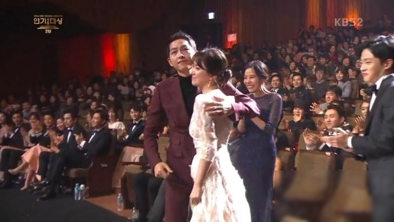 2016年KBS演技大賞最重要大獎由《太陽的后裔》宋仲基和宋慧喬獲得,兩人一上臺皆難掩激動情緒,忍不住哽咽。宋慧喬對于獲得“最佳CP獎”發(fā)表感言,“和喜歡的人一起領(lǐng)獎,真的很開心”,在主持人全炫茂的詢問之下,滔滔不絕地稱贊宋仲基就和劇中的劉時鎮(zhèn)一樣,“幽默、聰明、真誠又溫柔”,宋仲基則回贊對方,“真的非常美麗又大方”,他們更現(xiàn)場重現(xiàn)了“什么血型”的撒嬌,彼此溺愛的眼神超吸睛。