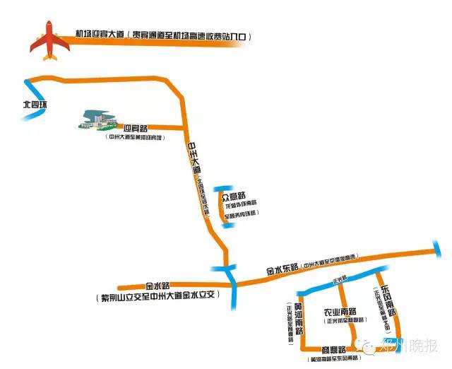 2、機場迎賓大道(貴賓通道至機場高速收費站入口)、中州大道(北四環(huán)至鄭汴路)、迎賓路(中州大道至黃河迎賓館)、金水東路、(京港澳高速至中州大道)、金水路(中州大道金水立交至紫荊山立交立交)、黃河東路(中州大道黃河立交至九如路)、眾意路(龍湖外環(huán)南路至商務內(nèi)環(huán)路)、黃河南路(正光路至商鼎路)、農(nóng)業(yè)南路(正光街至商鼎路)、東風南路(正光街至榆林北街)、商鼎路(東風南路至黃河南路)等道路和路段。經(jīng)過以上道路和路段的車輛和行人,遇到臨時交通管制時,可以提前就近選擇其它道路繞行。