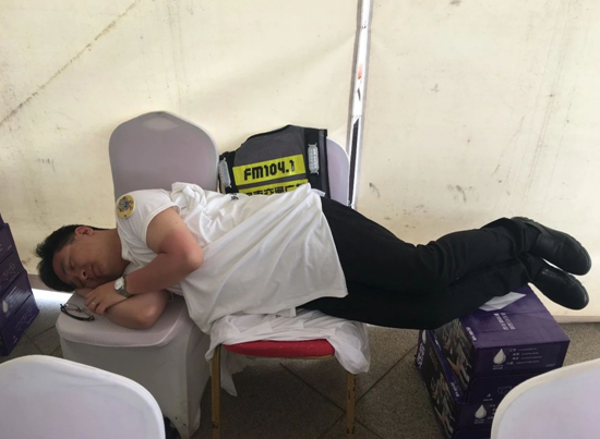 為了保證大家順利進園,《南方談交通》的主持人劉翔第一天就被曬傷了,間隙時間,拼出來兩個凳子就瞬間睡著。