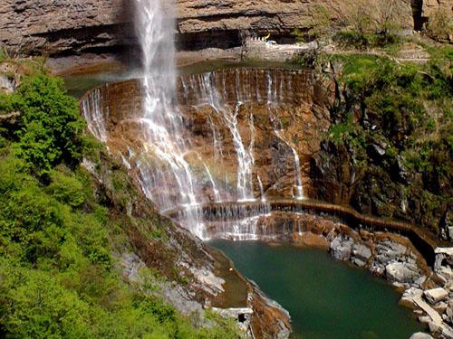 紅石河碧水橫溢、紅綠相映、色彩斑斕、明麗如畫,因海拔1100米被譽(yù)為“太行天河”。從紅石河畔俯瞰,山谷幽深、流水潺潺,河水順著光潔平整、錯落有致的紅石板流淌不息,直沖而下形成又一著名景點(diǎn)——天河大瀑布。紅石河的右畔是觀音洞,觀音洞里的泉水常年不斷、甘甜可口,用來泡茶增三分香,煮飯?jiān)黾尤痔?,現(xiàn)在敞開供應(yīng),保你一杯解風(fēng)塵,二杯去疲乏,三杯大汗落。 八里溝的山,八里溝的水,甚至八里溝的每一塊石頭都引起世界的好奇。景區(qū)森林覆蓋率達(dá)90%,如今,八里溝景區(qū)已經(jīng)成為國內(nèi)很多前衛(wèi)、時(shí)尚的游客非常向往的一個(gè)人間天堂、世外桃源,也是春季旅游的經(jīng)典線路。