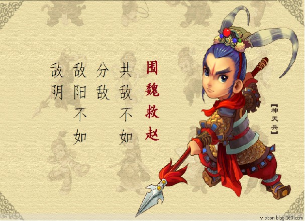 譯文:攻打兵力集中的敵人,不如設(shè)法使它分散兵力而后各個(gè)擊破;正面攻擊敵人,不如迂回攻擊其薄弱空虛的環(huán)節(jié)。本指圍攻魏國(guó)的都城以解救趙國(guó)。后指襲擊敵人后方的據(jù)點(diǎn)以迫使進(jìn)攻之?dāng)吵吠说膽?zhàn)術(shù)。現(xiàn)借指用包超敵人的后方來(lái)迫使它撤兵的戰(zhàn)術(shù)。