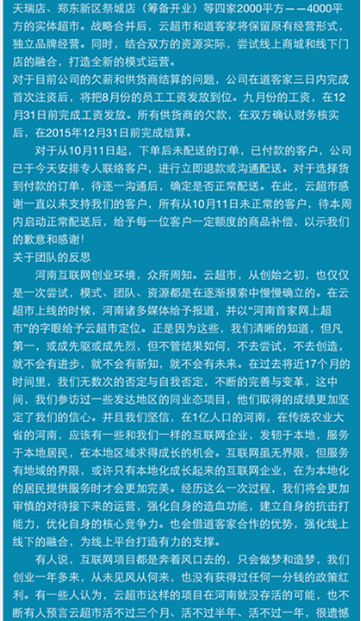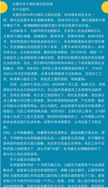 最近一周,在鄭州電商圈悄悄地流傳著這個(gè)消息……云超市倒閉了?董事長朱武源失聯(lián)了?讓我們看一下26號(hào)各媒體發(fā)出的消息: