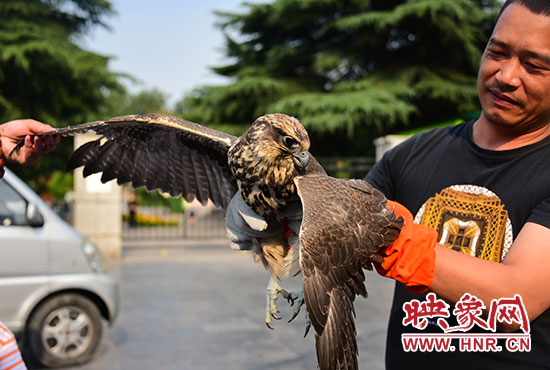 映象網(wǎng)快訊(記者 邱延波 文/圖)獵隼,大型猛禽,國家二級重點保護動物。6月15日,中牟一農(nóng)民竟然在蒜地里發(fā)現(xiàn)一只受傷的獵隼。