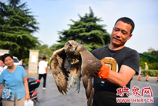 在人民公園西門,當(dāng)獵隼從紙箱里拿出時,霸氣十足威風(fēng)凜凜的它便引來了眾多市民的圍觀,有人猜是老鷹,有人猜是貓頭鷹。