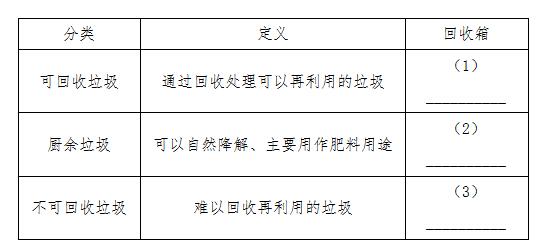 請(qǐng)你根據(jù)生活常識(shí),將以下垃圾填入上表對(duì)應(yīng)的“回收箱”類(lèi)別中。①?gòu)U燈管 ②瓷磚瓦片 ③香蕉皮 ④剩菜剩飯 ⑤喝過(guò)的茶葉 ⑥過(guò)期藥品 ⑦廢塑料袋 ⑧廢玻璃