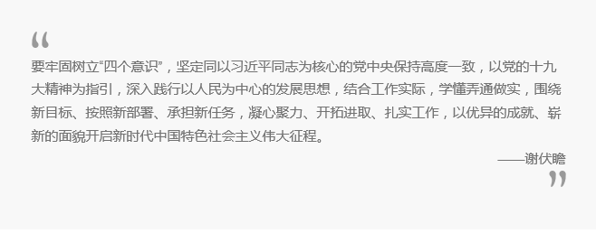 謝伏瞻說,黨的十九屆一中全會選舉習(xí)近平同志為黨的總書記,這是全黨全國各族人民的共同心愿,習(xí)近平總書記是全黨擁護(hù)、人民愛戴、當(dāng)之無愧的黨的領(lǐng)袖。大家要切實增強(qiáng)“四個意識”,同以習(xí)近平同志為核心的黨中央保持高度一致。中國特色社會主義進(jìn)入了新時代,這是一個重大的政治判斷,為我們國家發(fā)展標(biāo)明了準(zhǔn)確的歷史坐標(biāo)和發(fā)展方位。