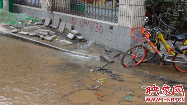 早上6時30分許,未來路辦事處巡防隊員司廣紅等人發(fā)現(xiàn)居民因小區(qū)積水,出行困難,用磚塊鋪路,方便居民進出。由于不明確是自來水管道還是熱力管道發(fā)生了爆裂,巡防隊員也找不到附近的閥門,只好先撥打鄭州城建服務熱線12319反映此事。