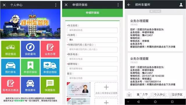 不出家門,也可以領(lǐng)到綠標自2015年7月27日起,鄭州車管所聯(lián)合鄭州環(huán)保局在微信公眾平臺推出了“微信申領(lǐng)環(huán)保標”的服務(wù),如果您是“6年免檢”車輛的車主,即可通過微信平臺在線申領(lǐng)綠色環(huán)保標,申領(lǐng)成功后,會有專門的快遞人員送標到家。