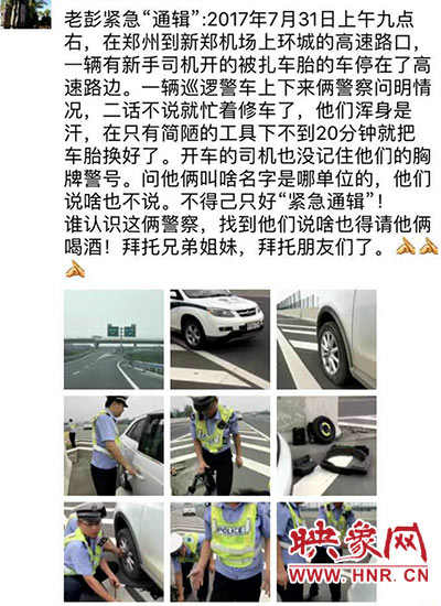 據(jù)介紹,7月31日9時許,河南省公安廳高速交警總隊一支隊執(zhí)勤民警徐玉成、余曉偉巡邏到機場高速與鄭州西南繞城高速互通處附近時,看到北向南方向一輛白色轎車停在高速路邊,上前一看車輛前輪輪胎爆胎了,司機急著去開會卻不會修車,急得滿頭大汗卻無從下手,民警了解情況后,二話沒說在酷暑高溫天氣迅速幫司機把車胎換好,司機連聲表示感謝,由于當時急著去開會,沒有來得及問出民警姓名,于是就出現(xiàn)了開頭“緊急通緝”的一幕,公司領(lǐng)導和員工也紛紛轉(zhuǎn)發(fā)正能量,“通緝”找人。伸手幫一把,傳遞正能量一大片。