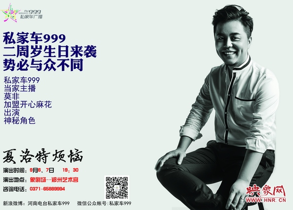 活動內(nèi)容:正值私家車999兩歲生日來臨之際,私家車999特邀開心麻花全國票房口碑雙料冠軍《夏洛特煩惱》在鄭州象劇場開演,私家車999主持人將擔綱劇中角色,9月6日、9月7日象劇場鄭州藝術(shù)宮,一起來過生日吧!