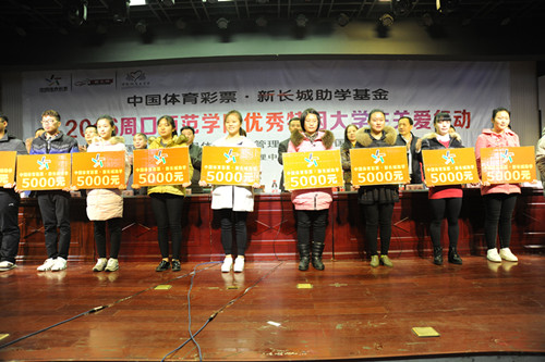 2016年12月7日、8日,中國(guó)體育彩票品牌公益項(xiàng)目“中國(guó)體育彩票新長(zhǎng)城助學(xué)基金”2016年捐贈(zèng)儀式分別在商丘師范學(xué)院和周口師范學(xué)院舉行。據(jù)悉,通過(guò)此次捐贈(zèng)活動(dòng),河南省體育彩票管理中心共向兩個(gè)學(xué)校來(lái)自全國(guó)14省區(qū)的120名優(yōu)秀貧困大學(xué)生每人捐助5000元,幫助他們和他們的家庭,減輕學(xué)習(xí)生活中的經(jīng)濟(jì)負(fù)擔(dān)。