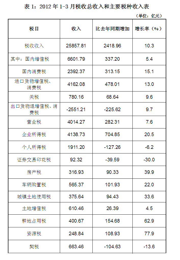 昨天財(cái)政部公布“2012年一季度稅收收入情況分析”,透露2012年1-3月全國稅收總收入完成25857.81億元,比去年同期增加2418.96億元,增長10.3%,增速大降(去年同期增速為32.4%)。