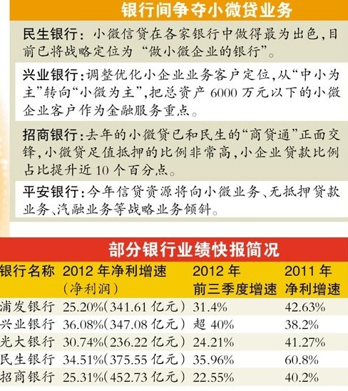 其中一個重要的對手將是興業(yè)銀行。興業(yè)銀行昨日披露,2013年,興業(yè)銀行積極調(diào)整優(yōu)化小企業(yè)業(yè)務(wù)客戶定位、經(jīng)營戰(zhàn)略和發(fā)展目標(biāo),將總資產(chǎn)6000萬元以下的小微企業(yè)客戶作為金融服務(wù)重點(diǎn),并配套實(shí)施一系列體制機(jī)制改革措施和投入資源保障,全面推進(jìn)小微企業(yè)金融服務(wù)升級。