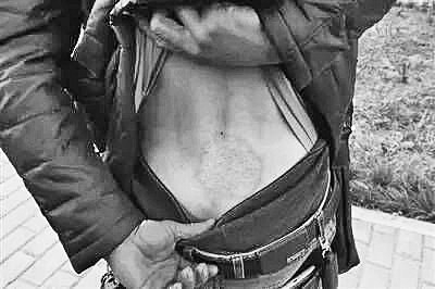 杜強掀起外衣,背上露出被煤球烤的印跡。(圖片為當事人提供)