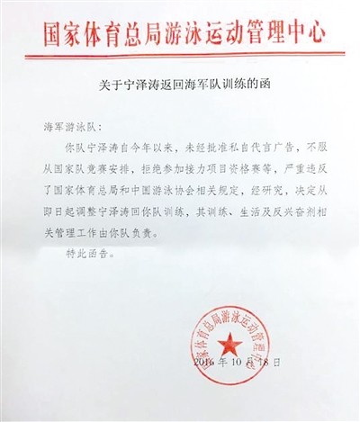 日前有媒體報(bào)道寧澤濤離隊(duì)的消息,并附有國(guó)家體育總局游泳運(yùn)動(dòng)管理中心內(nèi)部文件的照片,文件內(nèi)容為:“海軍游泳隊(duì):你隊(duì)寧澤濤今年以來(lái),未經(jīng)批準(zhǔn)私自代言廣告,不服從國(guó)家隊(duì)競(jìng)賽安排,拒絕參加接力項(xiàng)目資格賽,嚴(yán)重違反了國(guó)家體育總局和中國(guó)游泳協(xié)會(huì)相關(guān)規(guī)定,經(jīng)研究,決定從即日起調(diào)整寧澤濤回你隊(duì)訓(xùn)練,其訓(xùn)練、生活及反興奮劑相關(guān)管理工作由你隊(duì)負(fù)責(zé)。特此函告?!睍r(shí)間落款為2016年10月18日。
