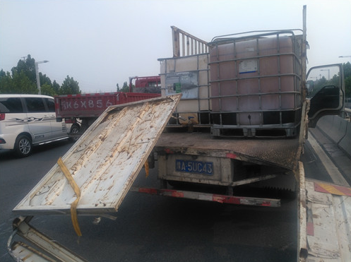 據(jù)貨車司機(jī)介紹,他車上拉的這些邊長(zhǎng)約1米的方形大桶是裝醬油用的,當(dāng)天拉著這些空桶從新鄭來到鄭州,因?qū)β窙r不熟,不知道此處上橋口有3米的限高桿,直到上橋時(shí)撞上限高桿后,才知道貨車不讓上三環(huán)立交橋。