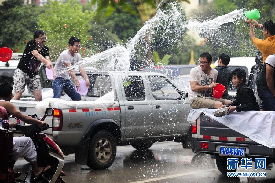 4月12日,各族群眾和游客在德宏芒市廣場(chǎng)上體驗(yàn)潑水狂歡。當(dāng)日,云南省德宏傣族景頗族自治州繼續(xù)舉行2013年國(guó)際潑水狂歡節(jié),各族群眾和游客歡聚在德宏芒市廣場(chǎng)狂歡潑水,祈福吉祥平安。 新華社記者秦朗 攝