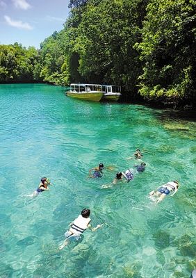 說帕勞是一個水漾的天堂,一點也不為過。這里不僅以海底景觀聞名于世,被海洋學(xué)家公認為世界七大海底奇觀之首,海面景觀也同樣令人贊嘆。由于帕勞的海水清澈無污染而其海底景觀造型奇特,一會兒是黑黑的礁石,一會兒是斑斕的軟硬珊瑚,抑或是細細沙礫,還有遠古時代沉積的火山灰,這一切都被清澄的海水毫無保留地映上了海面,令海水有7種不同的顏色,這讓每一位到此地的游客都贊嘆不已,更成為潛水者的勝地。