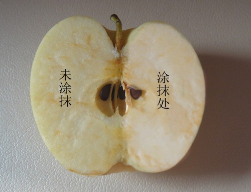 把涂抹了精華液的蘋(píng)果放在未見(jiàn)陽(yáng)光的桌上4小時(shí)后,涂抹精華液的右面沒(méi)有氧化變黃,依然水分充足,滋潤(rùn)新鮮,而未涂抹的左面就因?yàn)檠趸兊冒迭S干澀。這就說(shuō)明它的抗氧化性極強(qiáng),對(duì)肌膚有很強(qiáng)的保護(hù)作用。