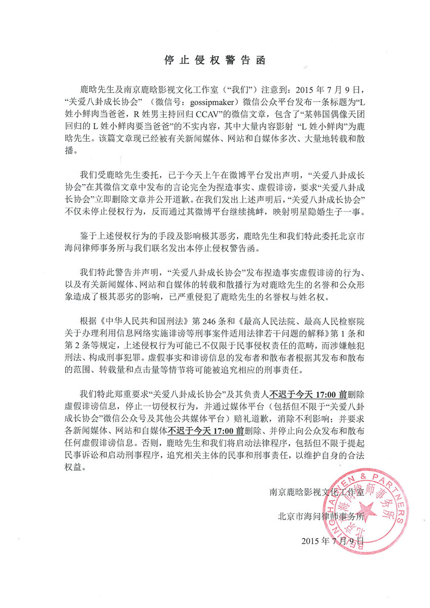7月9日,關(guān)于“關(guān)愛八卦成長(zhǎng)協(xié)會(huì)”微信公眾號(hào)發(fā)布“L姓小鮮肉當(dāng)爸爸”一文,影射鹿晗先生一事,鹿晗工作室發(fā)律師函否認(rèn)并警告其造謠生事,稱:“我們受鹿晗先生委托,已于今天上午在微博平臺(tái)發(fā)出聲明,“關(guān)愛八卦成長(zhǎng)協(xié)會(huì)”在其微信文章中發(fā)布的言論完全為捏造誹謗,要求‘關(guān)愛八卦成長(zhǎng)協(xié)會(huì)’立即刪除文章并公開道歉。在我們發(fā)出上述聲明后,‘關(guān)愛八卦成長(zhǎng)協(xié)會(huì)’不僅未停止侵權(quán)行為,反而通過其微博平臺(tái)繼續(xù)挑釁,映射明星隱婚生子一事,鑒于行為惡劣,發(fā)出警告函。”