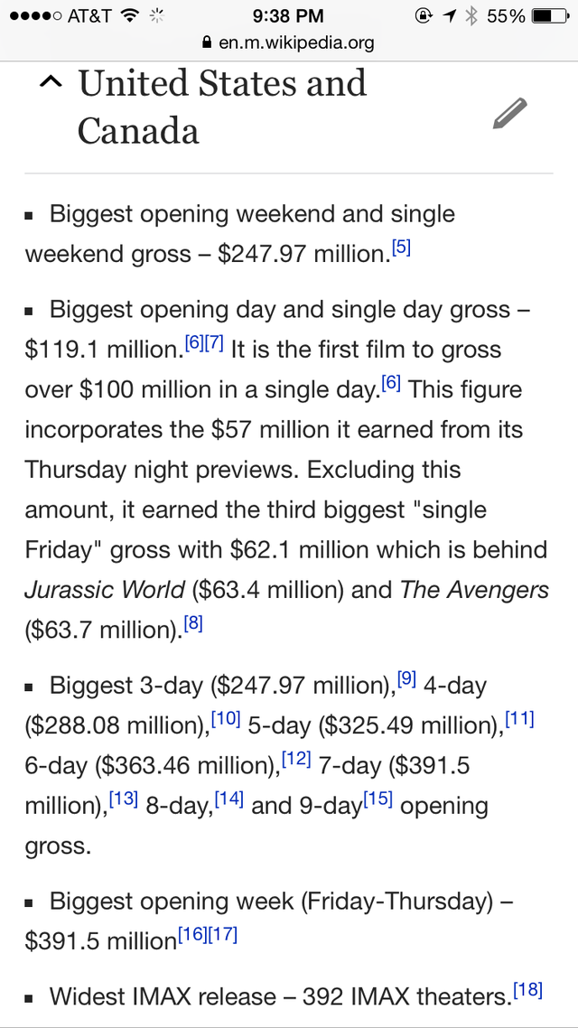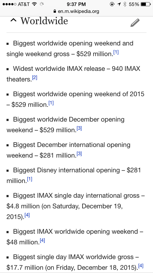 截圖只占該詞條的五分之一都不到哦,這齊刷刷的一片 Biggest/ Widest 真是氣壯山河?。☆A(yù)計到本周末《星戰(zhàn)7》將在北美拿下5億票房,比前任紀(jì)錄保持者《侏羅紀(jì)世界》快了近整整一倍之多!”票房記錄粉碎機“之稱果然名副其實!