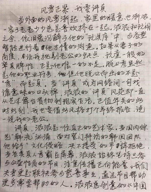 網(wǎng)易娛樂(lè)1月26日?qǐng)?bào)道 日前,演員周立波在美國(guó)長(zhǎng)島因涉嫌持有槍支、藏有毒品而被美國(guó)警方逮捕,在繳納保釋金后獲得保釋。此前周立波先是在美國(guó)通過(guò)媒體表示“持有的槍支合法,毒品并非其所有。之后還曾發(fā)微博自證“事實(shí)和法律將還我清白”。而就在1月26日早上,周立波妻子胡潔通過(guò)微博發(fā)布自己的一封手寫信,力贊丈夫周立波“完美”。對(duì)于近日的是非,她更表示“請(qǐng)不要過(guò)早下結(jié)論,先操心自己的生活”。
