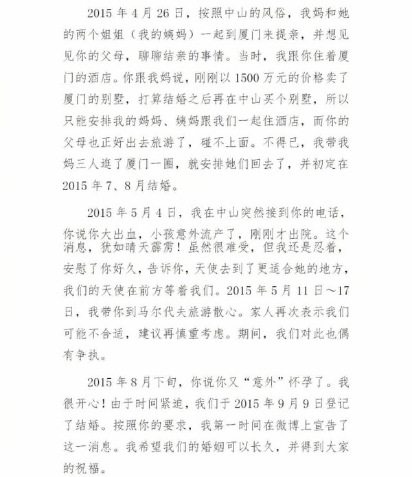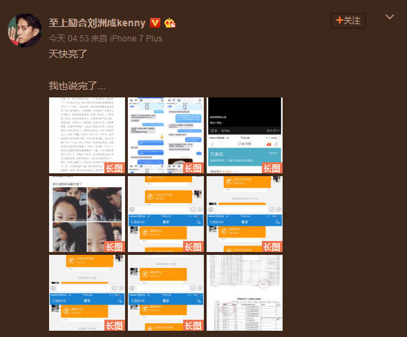 搜狐娛樂訊 5月23日凌晨,劉洲成發(fā)微博回應家暴致前妻林苗流產(chǎn)及要求前妻出錢買房等傳聞。劉洲成在文中以時間為緯度講述他與前妻相識相愛到結婚的過程,還列舉出前妻從懷孕到流產(chǎn)的事例,劉洲成在文中還稱“從認識你開始,就從沒花過你和你家一分錢”。此外,劉洲成更是曬出了昔日的聊天記錄、代付清單、借記卡賬戶歷史明細清單等證據(jù),疑似反駁前妻所述不實。