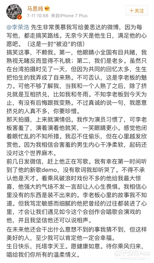 原來(lái)是因?yàn)轳R思純?cè)谖⒉懥艘环忾L(zhǎng)信祝福李榮浩的生日,她還調(diào)侃這是一封“被迫”的信。
