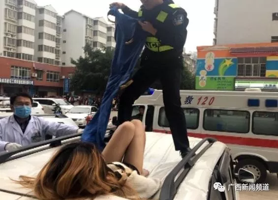 據(jù)來(lái)賓市公安局城警支隊(duì)東盟警務(wù)站覃警官介紹,當(dāng)天上午8時(shí)20分左右,他們接到群眾報(bào)警后趕到現(xiàn)場(chǎng),看到一名年輕女子躺在一輛面包車頂上,嘴唇出血,腰部有血跡。