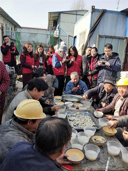 與此同時,第三路名嘴李璇和王澄也在鄭州市北建材附近的工地上行動了起來。他們帶著15名義工來到工地食堂,為民工兄弟們煮起了餃子。餃子出鍋,主持人李璇和王澄和民工兄弟們圍坐在一起,聊著天,品嘗熱騰騰的水餃。在現場,主持人還遇到了一位特殊的老人——劉春娥。劉老太太常年堅持義務給農民工送衣服鞋墊,可以說,鄭州工地上的人都認識這位老太太。今天,劉老太太正巧又給這里的工人們帶了40對新納好的鞋墊兒,前不久,老太太才送來了不少衣物。拿著新鞋墊,吃著熱餃子,民工兄弟們個個笑開了花。
