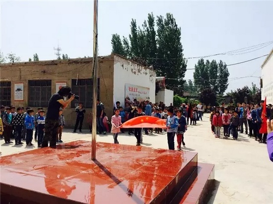 少先隊員向參加捐贈儀式的愛心代表人士敬獻紅領(lǐng)巾,并獻上孩子們花費一下午時間親自采摘的鮮花,并舉行升國旗儀式。