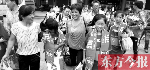 昨天下午3點(diǎn),在新鄭國(guó)際機(jī)場(chǎng)大廳等待已久的隊(duì)員家長(zhǎng)們,終于迎來臨潁縣女子足球隊(duì)的小隊(duì)員們。當(dāng)家長(zhǎng)們看見隊(duì)員從大廳里整齊走出來,都圍了上去,紛紛念叨著“瘦了,黑了”。李女士說,大約有7名小隊(duì)員的家長(zhǎng)來鄭州接機(jī),幾乎所有的孩子河南省都沒出過。隨后,小隊(duì)員和家長(zhǎng)們陸續(xù)坐上了趕往河南建業(yè)球場(chǎng)的大巴。