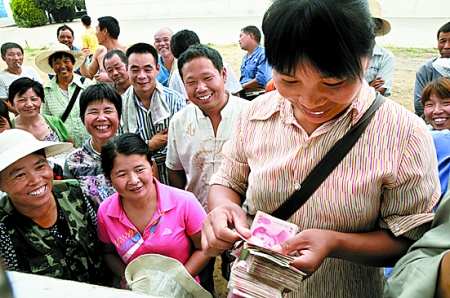 6月26日,在省糧油對外貿(mào)易有限公司郾城糧食儲備庫,前來賣糧的農(nóng)民高興地數(shù)著手中的鈔票。