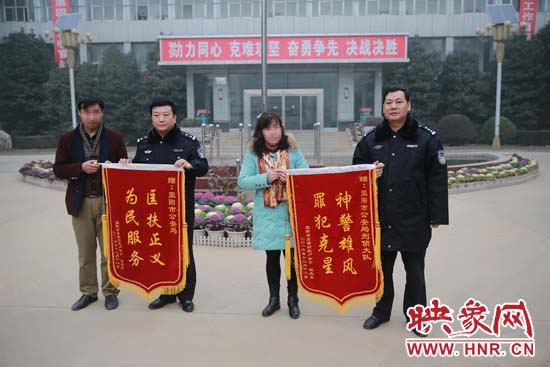 映象網(wǎng)訊(記者 王文凱 通訊員 牛智瑞 薛勇)滎陽17歲男孩盧健(化名)在被困傳銷窩點21天后,滎陽警方跨省將其營救。20日上午8時許,心存感激的孩子父母及親屬敲鑼打鼓來到滎陽市公安局,把“匡扶正義,為民服務(wù)”“神警雄風,罪犯克星”,兩面錦旗贈給公安局,局長夏日紅和政治部主任楚宏偉親自從家屬手中接過兩面錦旗。無法表達內(nèi)心感激之情的盧女士拿出兩萬元現(xiàn)金要對專案組民警表示謝意,遭到夏日紅局長拒絕。