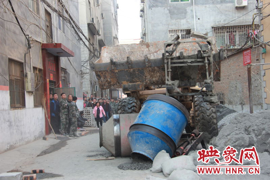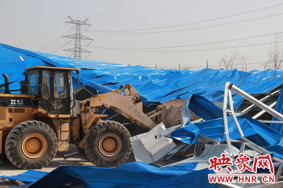 “轟”的一聲,位于滎陽市京城辦康砦村龍港路段南側(cè)附近一個(gè)私自搭建的彩鋼瓦棚被鏟車鏟倒,標(biāo)志著京城路街道拆除違法占地、違法建筑活動的正式開始。