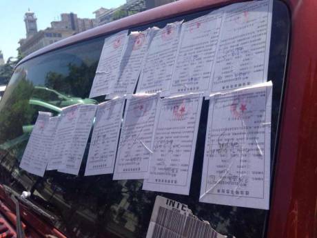 一輛紅色越野車(chē)上被10余張罰單覆蓋,引來(lái)不少市民圍觀。擋風(fēng)玻璃、后視鏡、前門(mén)的車(chē)窗上都被交警的罰單糊住了。