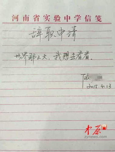 “世界那么大,我想去看看。”今年4月,鄭州的中學(xué)女老師顧少強(qiáng)因?yàn)橐环獗毁潪椤笆飞献罹咔閼艳o職信”在網(wǎng)絡(luò)上掀起風(fēng)浪。